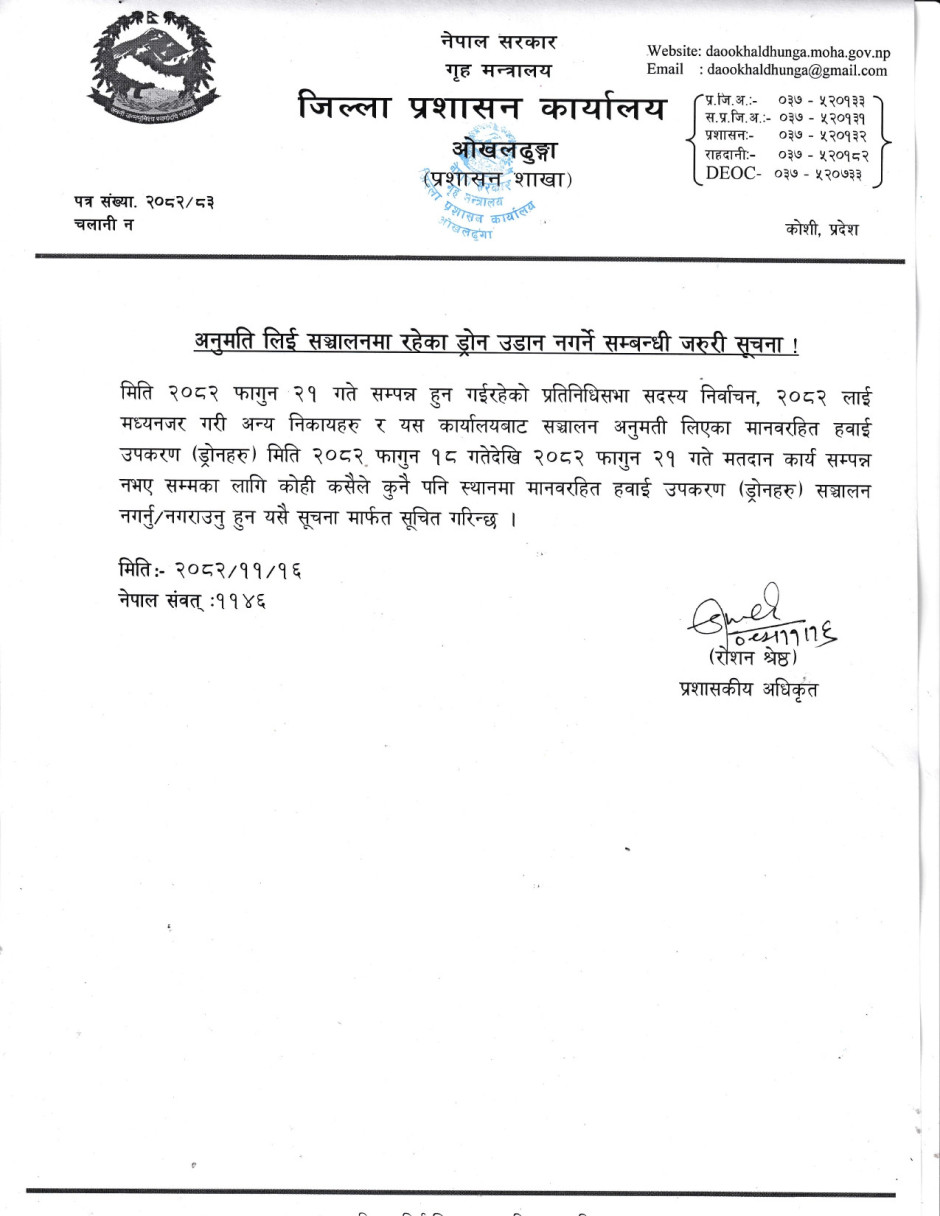 © सर्वाधिकार सुरक्षित जिल्ला प्रशासन कार्यालय, ओखलढुंगा .