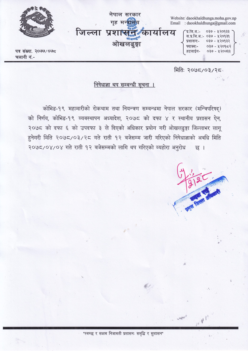 २०७८ असार २८ गतेको निषेधाज्ञा थप गरिएको सम्बन्धी सूचना ।