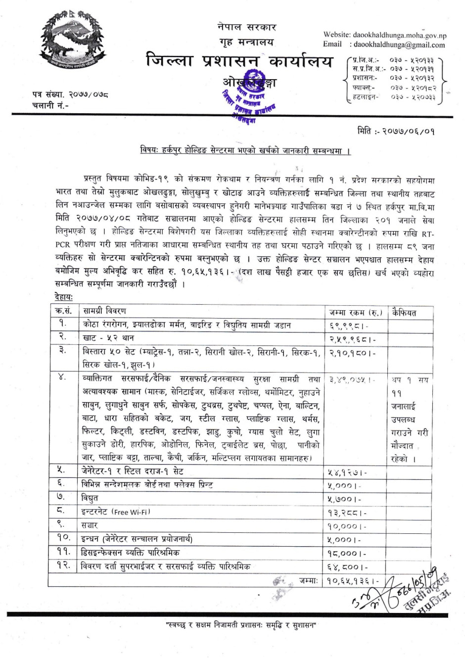 हर्कपुर होल्डिङ सेन्टरमा भएको खर्चको जानकारी सम्बन्धमा ।