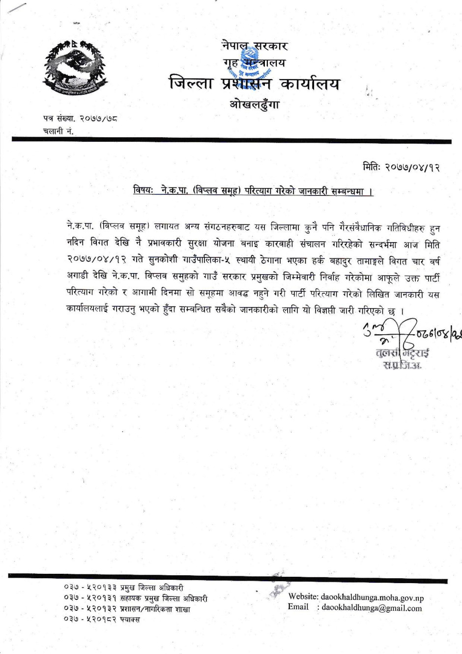 ने.क.पा. (विप्लव समूह) परित्याग गरेको जानकारी सम्बन्धमा ।