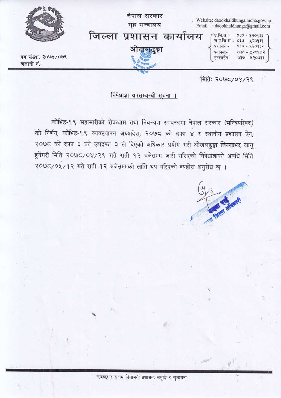 निषेधाज्ञा थपसम्बन्धी सूचना । २०७८/०५/१२ गतेसम्म