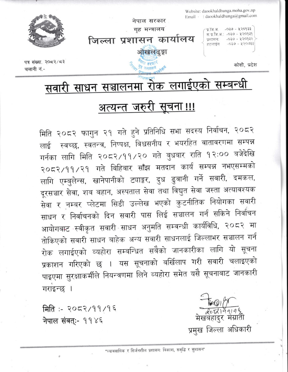 सवारी साधन सञ्चालनमा रोक लगाईएको सम्बन्धी अत्यन्त जरुरी सूचना !