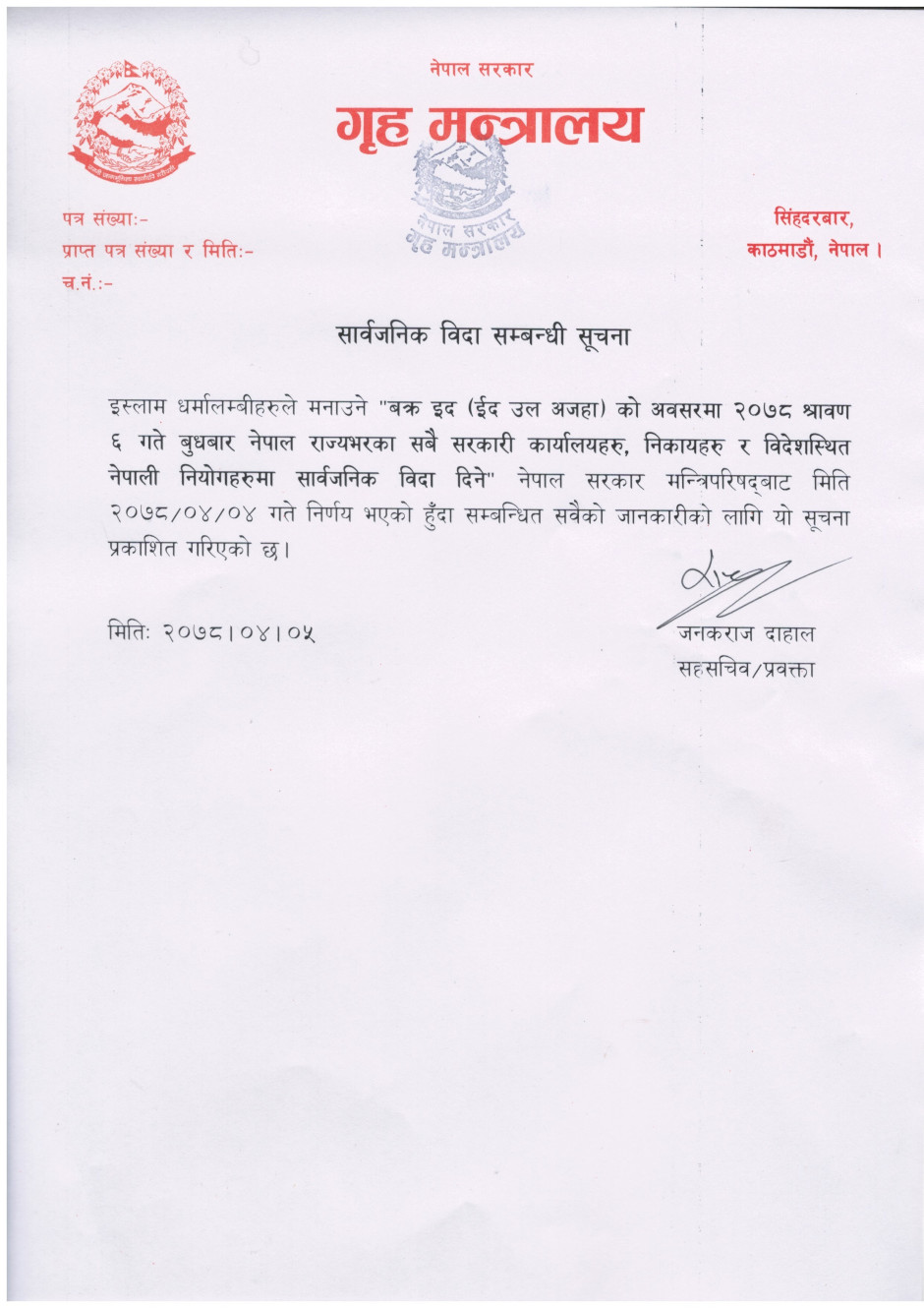 २०७८ श्रावण ६ गते सार्वजनिक विदा सम्बन्धी गृह मन्त्रालयको सूचना ।