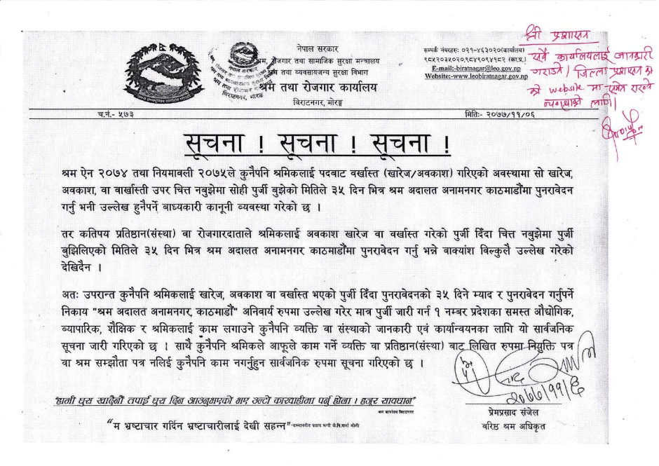 श्रम तथा रोजगार कार्यालय, विराटनगरको सूचना